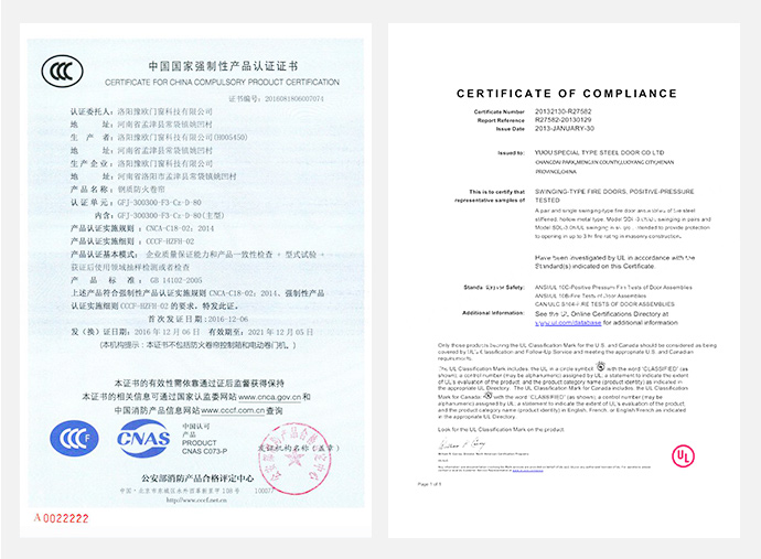 鋼質(zhì)防火門是指用冷軋薄鋼板作門框、骨架、門板,在門扇內(nèi)填充不燃隔熱材料,根據(jù)需要可以在門扇上安裝復(fù)合防火玻璃及門扇上方設(shè)有A類復(fù)合防火玻璃亮窗,并配以防火五金配件所組成的能滿足耐火完整性和隔熱性要求的門。鋼質(zhì)防火門按耐火極限可分為甲 級(jí)、乙級(jí)、丙級(jí)三類防火門,其耐火極限要求分別為72min、54min和36min。鋼質(zhì)防火門應(yīng)采用冷軋薄鋼板制作門框、門扇面板及加固件。門框與門扇鋼板厚度分別為1.2mm~1.5mm和0.8mm~1.2mm。加固件鋼板厚度為1.2mm~1.5mm,如設(shè)有螺孔則不低于3mm。用于鋼質(zhì)防火門的五金配件需要是耐火五金配件,主要五金配件為:防火合頁(鉸鏈)、防火插銷、防火門鎖、防火順序器和防火閉門器等。
